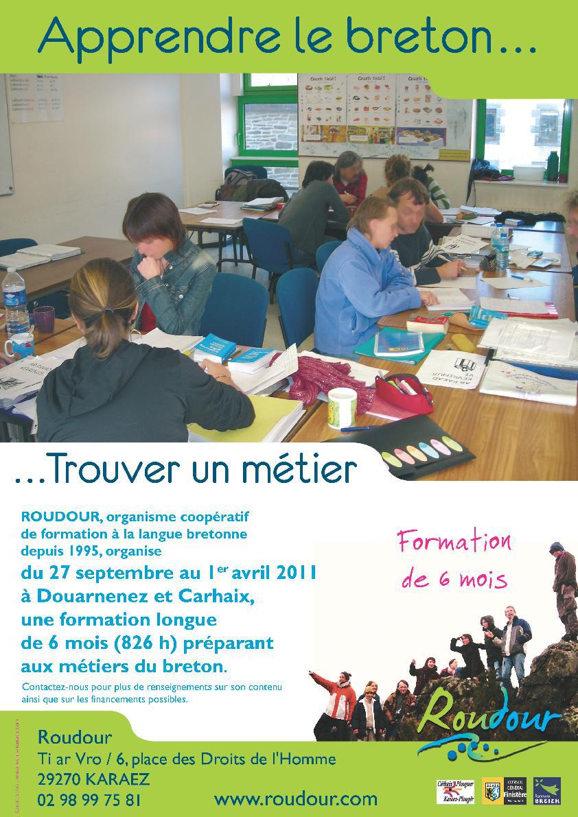 Il est toujours possible de s'inscrire aux formations en langue bretonne de 6 mois organisées par Roudour à Carhaix et Douarnenez. . Les deux sessions se dérouleront du 27 septembre 2010 au 1er avril 2011 et compteront 826 heures de formation (dont 140 en milieu professionnel). Elles visent à permettre aux stagiaires d'atteindre un niveau suffisant afin d'exercer une activité professionnelle en breton, voire d'utiliser la langue dans la vie de tous les jours.