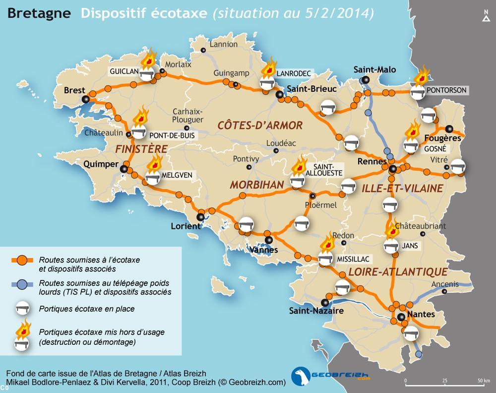Si les portiques écotaxe ne sont plus attaqués en Bretagne, ils le sont dans d'autres régions, mais, tout se passe comme si seule la presse locale pouvait se permettre d'en parler. Ont fait l'objet d'une tentative d'incendie et ont été démontés ou devraient l'être : Pontorson (Manche) - 28 décembre La Séguinière (Maine-et-Loire, près de Cholet) - 2 février La Trinité (Manche, près de Villedieu-les-Poêles) - 9 février Vernouillet (Eure-et-Loir) - 10 février