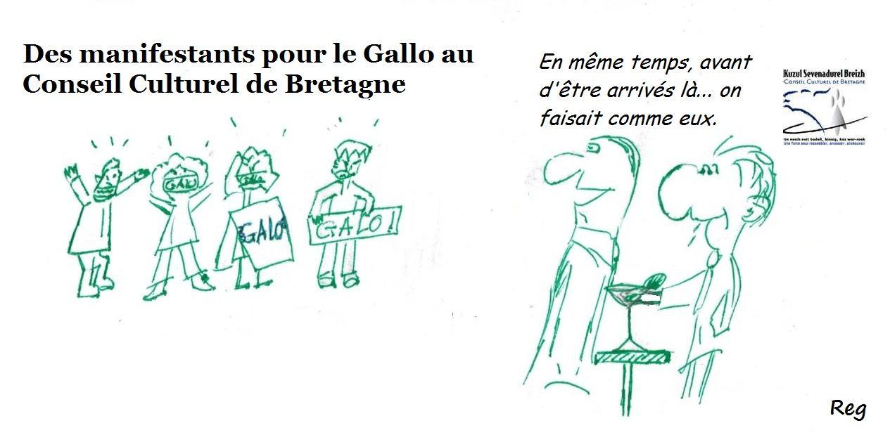 C'est difficile de dire quelque chose sur la base d'un simple dessin. Pour moi,les deux langues (breton et gallo) ne sont pas inférieures l'une à l'autre et elles subissent le français. J'ai du mal à comprendre pourquoi une manif au Conseil Régional plutôt qu'à la Préfecture ou au Rectorat. Et je trouve un peu raide les attaques de militants du gallo contre le breton. Ce n'est pas pour le breton que les gens abandonnent le gallo, et si les militants gallos ne veulent pas d'écoles, c'est à eux d.e voir pourquoi