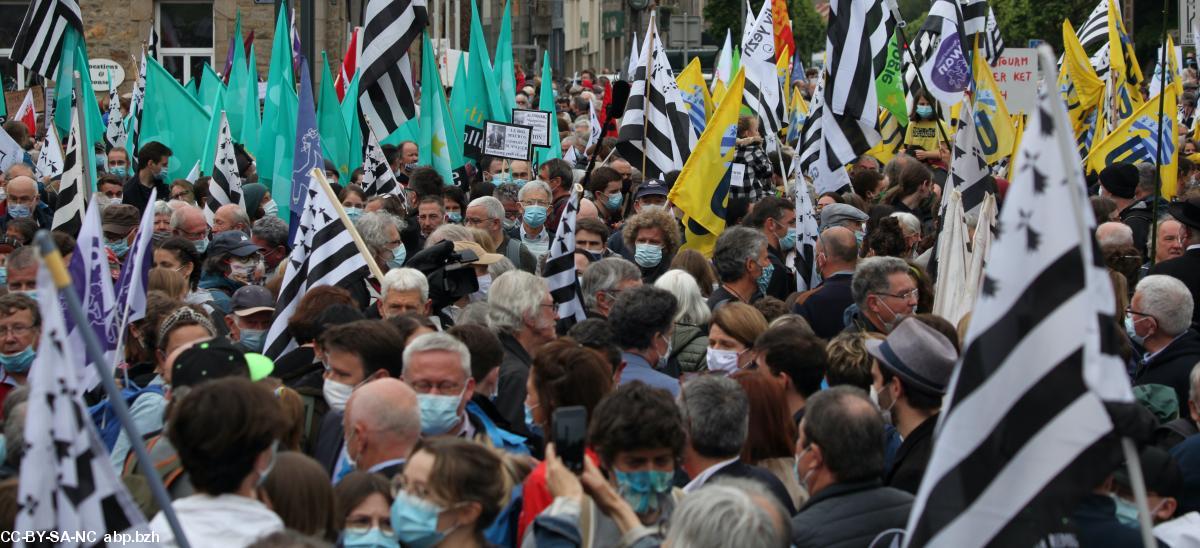 Parmi les 10 000 manifestants, une jeunesse bretonnante tumultueuse et bien consciente du danger que court la langue de leurs ancêtres a défilé sous bannières, gwenn-ha-du et pancartes en scandant à tue-tête Brezhoneg yezh ofisiel.