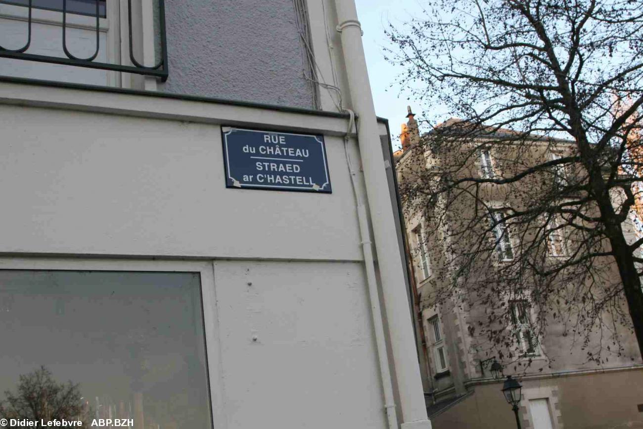 A deux pas de la statue de la duchesse Anne de Bretagne, réalisée par Jean-Fréour, face à l’entrée principale du Château des ducs de Bretagne, la rue du Château. Ou plutôt, nous pourrons dire dorénavant et officiellement, Straed ar C’hastell. Amis bretons, regardez cette plaque. D’autres vont suivre. Le dévoilement fut bref, et suivi d’une cérémonie plus officielle et néanmoins amicale, dans la Tour du Fer à Cheval, dans le Château des ducs voisin. Une cinquantaine de militants bretons de longue date, associatifs ou politiques ne voulaient pas manquer ce moment. Parmi eux, on reconnaît des membres de l’UDB, du Parti Breton, on reconnaît le député François de Rugy, très entouré, des membres de l’association Bretagne Réunie, du Centre Culturel breton Yezhoù ha Sevenadur, de l’Agence culturelle bretonne, du Comité des Vins Bretons et Visant Roue, directeur de l'Office public de la langue bretonne, Ofis ar brezhoneg.Un discours en breton de Pierre-Emmanuel Marais
