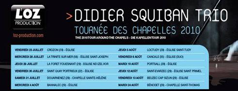 24/08/2010 : DIDIER SQUIBAN BENODET (29) Tournée des Chapelles 2010 / Didier Squiban Trio. Eglise St Thomas. 21 H. Billets en vente (13 € + frais) au Minigolf de Bénodet 02 98 57 17 39. Sur place tarif unique : 15 €.