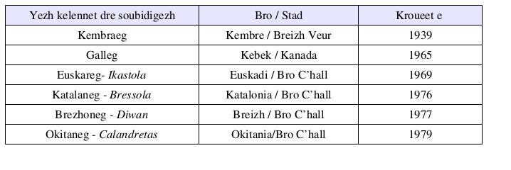 Etre 1965 ha 1979 oa bet krouet ar skolioù dre soubidigezh e Bro C’hall. Souezhusañ skouer : e Kebek e oa bet aozet un taol-arnod o reiñ plas d'ar galleg e klasadoù bugale saozneger evit ma c'hellfent deskiñ galleg dre soubidigezh, ken fall e oa neuze stad ar yezh-se. Hiziv an deiz e bro Gebek e vez 370 000 skoliad o teskiñ galleg dre « soubidigezh », ger implijet evit ar wech kentañ gant Lambert ha Tucker e 1972, sokioyezhourien e Kebek, hag o doa lakaet bugale da zeskiñ dre ar galleg, en arvar da neuze, a-hed an devezh-skol.
