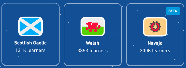 Trois langues celtiques figurent au programme pour les anglophones. L'application est particulièrement populaire chez les jeunes et le journal britannique the Guardian https://www.theguardian.com/education/2020/jan/02/duolingo-sparks-gaelic-boom-as-young-scots-shrug-off-cringe-factor rapporte que le gaélique écossais est la langue en plus forte progression. 127 000 sont inscrits pour apprendre le gaélique écossais, deux fois plus que le nombre de locuteurs actuels ! 385 000 sont inscrits pour le gallois et 927 000 pour apprendre l'irlandais.Plus vous connaissez de langues, plus vous êtes humain__Tomáš Garrigue Masaryk