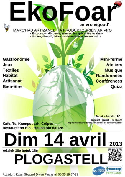 « Encourager, découvrir, valoriser les spécialités locales » La nouvelle école maternelle Diwan à Plogastel Saint Germain, unique en pays bigouden, organise pour la troisième fois une Fête éco-citoyenne conviviale et populaire pour soutenir la consommation de produits locaux, pour échanger des idées et des savoir-faire, pour rencontrer des artisans et des associations.