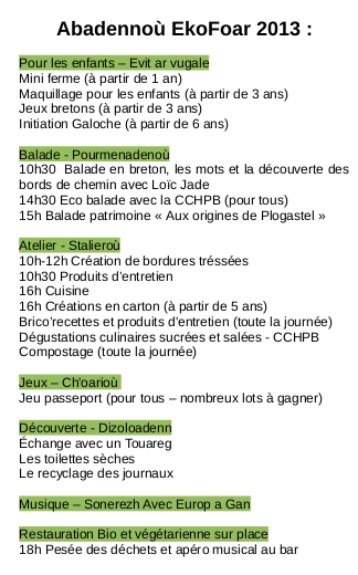 Nous vous proposons de découvrir : Kinnig a reomp deoc'h : Des fabricants de Jeux et Jouets en bois entièrement faits à la main dans le Finistère. Du vin en biodynamique (label AB) Des semences (variétés anciennes de tomates, plantes aromatiques et medicinales bio,ect…) Des Artisans, des Créateurs et créatrices de bijoux uniques et originaux Des Artistes peintres qui croquent la mer, les bateaux, les paysages, les chapelles … Des Commerçants : des épiciers, bouchers, fleuristes, Des Producteurs et des Transformateurs locaux, De l'Habillement en coton Bio pour petits et grands De la Puériculture De l'Habitat et de l'Eco habitat Du Bien être Des Associations Toute la journée des animations gratuites : Abadennoù evit an holl ha digoust :