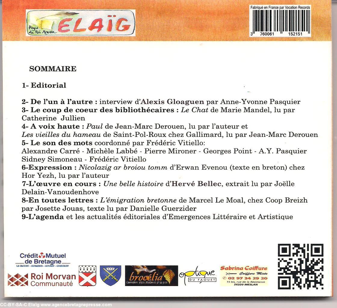 Elaïg, revue littéraire parlée (la seule en Bretagne), se présente sous forme de CD. Elle est publiée par l'association Emergences Littéraire et Artistique au Pays du roi Morvan (Gourin-Le Faouët-Guémené),