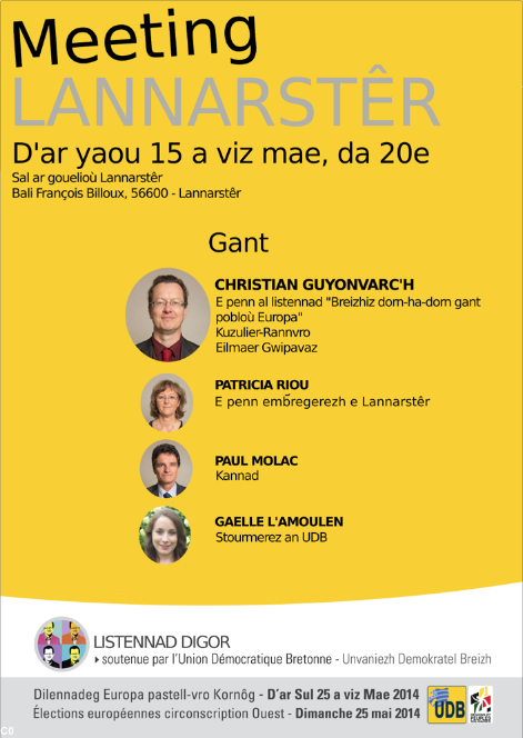 Dans le cadre des élections européennes, la liste "la Bretagne pour l'Europe sociale" organise une réunion publique à Lanester. Notre tête de liste, Christian Guyonvarc'h, sera présent et interviendra en