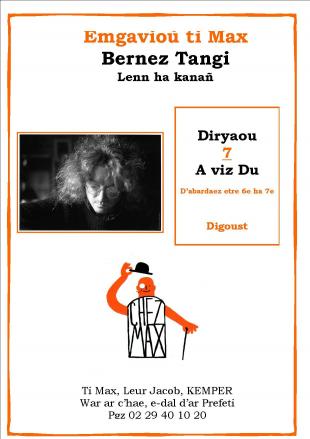 Emgavioù Ti Max vo gant Bernez TANGI Lenn ha kanañ barzhonegoù deus Ar Saouzanenn e brezhoneg ha e galleg. Diryaou 7 a viz Du d'abardaez etre 6e ha 7e Digoust Ti Max, leur