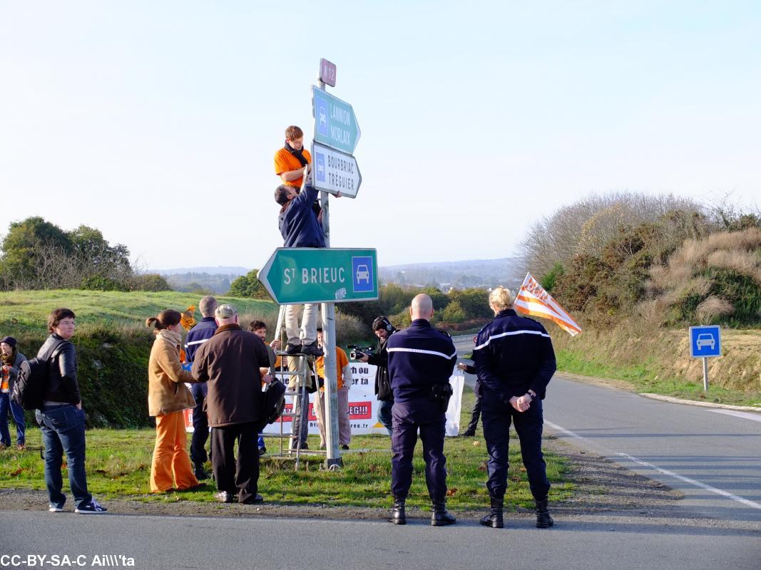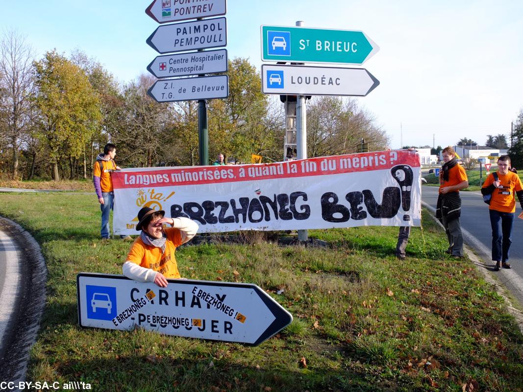 De nombreux panneaux directionnels vont bientôt être installés en bordure des voies express dans plusieurs lieux de Bretagne. À Quimper (29) au niveau de l'échangeur du Loc'h ainsi qu'à Rostrenen (22), lors de la réalisation d'une nouvelle tranche de travaux sur la RN 164. Nous exigeons qu'une signalétique bilingue et paritaire y soit installée rapidement, ainsi qu'à chaque fois que de nouvelles signalétiques seront mises en place. Ai'ta ! demande également aux élus de Bretagne d'intervenir auprès de la direction de la DIRO à Rennes pour qu'elle respecte enfin les demandes des Bretons et de leurs élus, et programme, le plus rapidement possible, la mise en place d'une signalétique bilingue français/breton en bordure des voies express de Bretagne. Si la situation ne se débloque pas rapidement, Ai'ta ! prévoit de reconduire les actions de démontage de panneaux monolingues mises en suspens depuis l'élection de François Hollande.