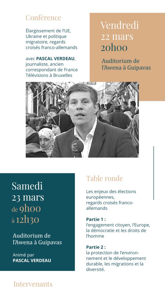 Interviendront : Benjamin Kurc, Responsable du Fonds citoyen franco-allemand Emmanuel Morucci, Président du CECI, conférencier Team Europe Direct Victor Warhem, Représentant du Centre de Politique Européenne Armelle Maltey, Représentant du Centre de Politique Européenne Alfons Scholten, Expert Erasmus+, membre du CECI-Allemagne Murielle Balaïan, Présidente du Comité de jumelage de Guipavas Pierre Menguy, Président de la Maison de l'Europe de Seine-Maritime et conférencier Team Europe Direct Ulrike Huet, Présidente de la fédération des Associations Franco-allemandes en Bretagne
