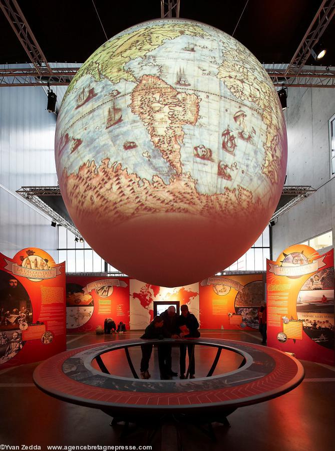 Un globe monumental sur lequel des images de mer sont projetées, surplombe une large table d'orientation circulaire déroulant une chronologie des tours du monde en 114 dates avec les grandes œuvres littéraires en contre-champs. Et pour cause, des ouvrages comme le Tour du monde en 80 jours de Jules Verne ont suscité une multitude de vocations.