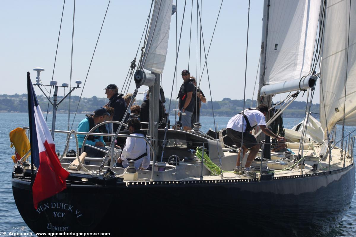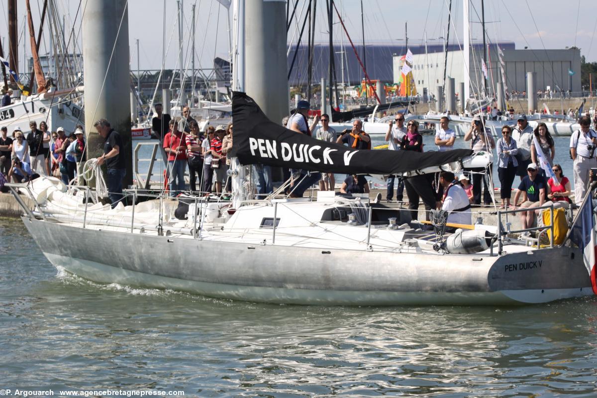 Plusieurs milliers de personnes étaient venues à la Cité de la voile Eric Tabarly, à Lorient, le 18 mai, pour accueillir, sous un soleil magnifique, les cinq "Pen Duick" mythiques d'Eric Tabarly. Le premier "Pen Duick", un magnifique bateau en bois que Tabarly avait hérité de ses parents et sauvé du cimetière marin existe toujours. Il fut construit en 1898 ! Cinq autres "Pen Duick" suivirent, tous de conception révolutionnaire, tant dans les formes que les matériaux. Tous gardaient ce beau nom breton, affectueux et élégant, qui signifie "Petite tête noire", autrement dit, "mésange charbonnière", mais dont l'orthographie correcte devrait être "Penn Duig".