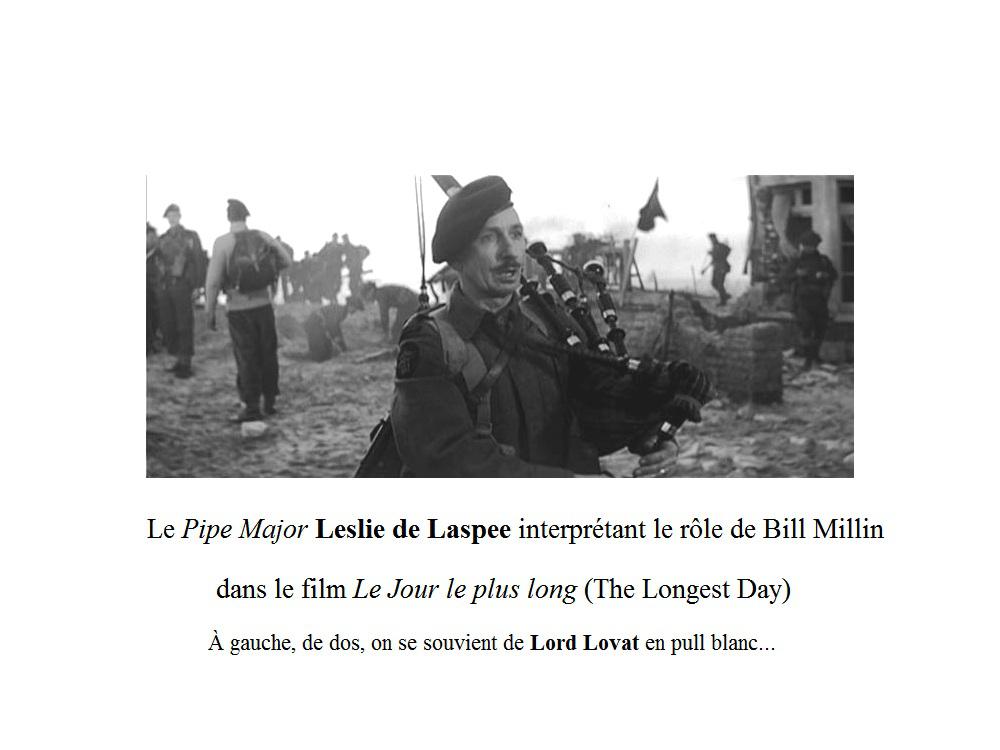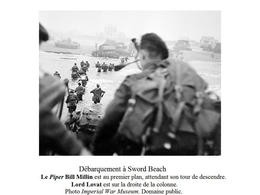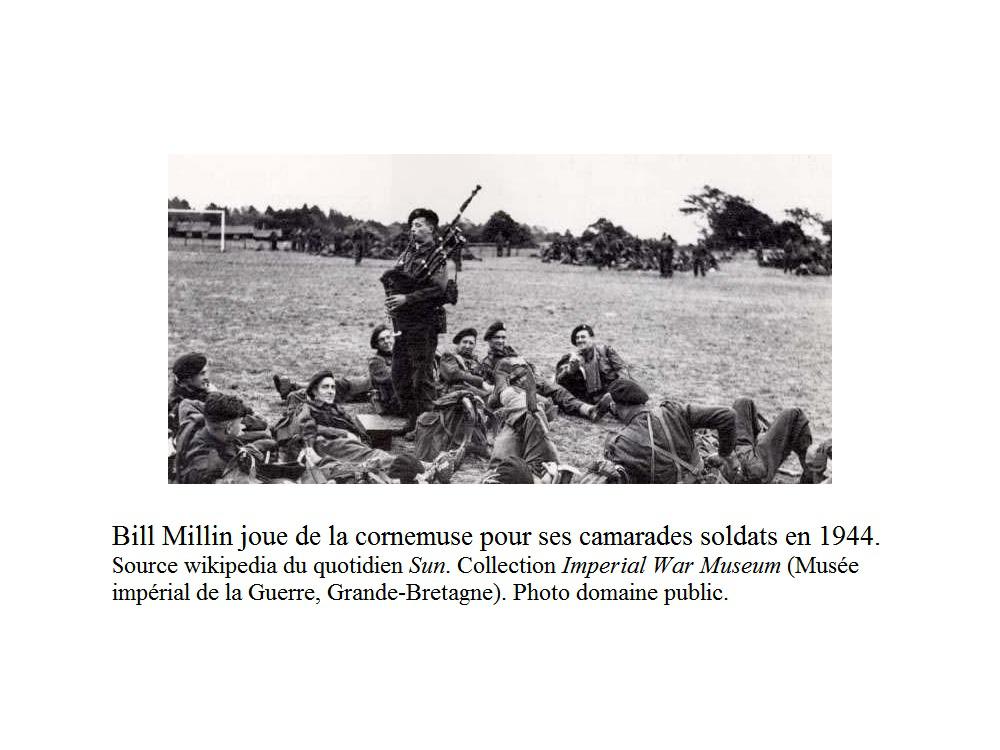 Immortalisé dans le film « Le jour le plus long » (The Longest Day) de Darryl Zanuck, 1962, – tiré du livre de Cornelius Ryan – Bill Millin est ce sonneur écossais qui débarque sur Sword Beach, Ouistreham, le 6 juin 1944 en kilt et en jouant sans relâche de sa cornemuse même dans la mer jusqu’à mi-cuisse, si je me souviens bien. Peu après il traverse le pont de Bénouville sur l’Orne (Pegasus Bridge) – but de la mission des Commandos Kieffer de venir en renfort de la 6e aéroportée britannique – en jouant toujours de sa cornemuse sous les tirs ennemis.