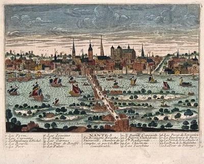 De même, il apercevait d'un coup d'oeil, les quartiers, les portes et les ports, au sud de la cité des ducs de Bretagne : la Fosse, la porte Saint Nicolas où fut enfermé Landais, la Barbacane, le râteau d'Erdre qui fermait l'entrée de l'Erdre dans la ville, la porte de la Poissonnerie, port Maillard, le Château et ses maisons construites dans les douves, puis le quartier de Richebourg et ses étuves municipales (qui cachaient souvent des maisons de tolérance).