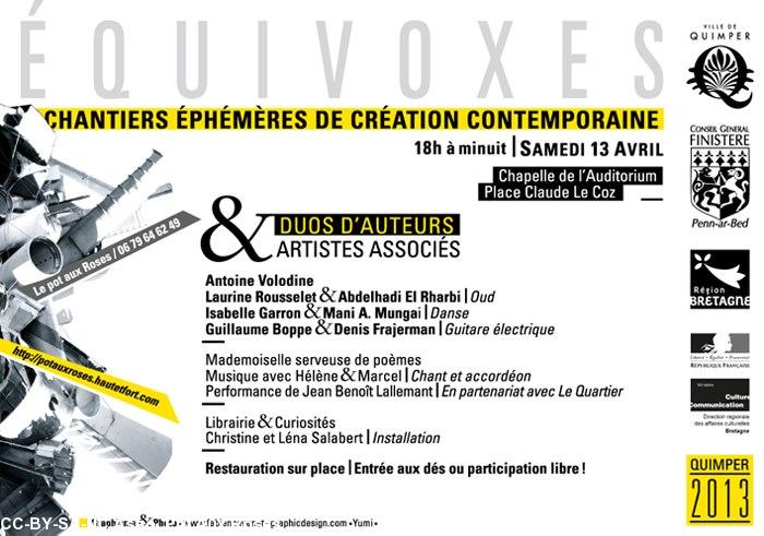 L\'Association \"Le Pot aux Roses\" propose la création \"Equivoxes\" le 13 avril de 18 h à minuit à la Chapelle de l\'Auditorium de Quimper (chantiers éphémères de créations contemporaines) tél : 06.79.64.6249 http://potauxroses.hautetfort.com