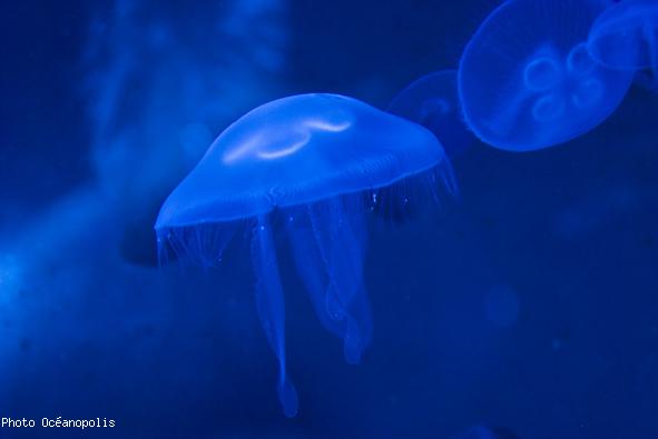 "Elles sont très spectaculaires, mais pas particulièrement dangereuses, car elles ne possèdent pas de tentacules urticantes pour paralyser leur proie", rassure Sébastien Cadiou, le responsable du pavillon tempéré d'Océanopolis, guère étonné d'observer les rhizostomes (rhysostoma pulmo) sur la côte atlantique. Cette espèce naît au large de la Charente, ce qui lui vaut le nom de méduse du Poitou.