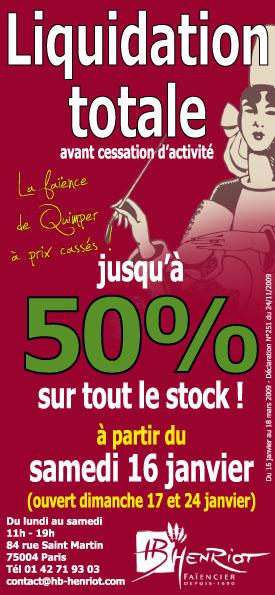 Nous tenons à vous informer de la liquidation de notre stock,du samedi 16 janvier au jeudi 18 mars 2010,conséquence de la fermeture définitive.