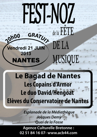 Fest-noz de la Fête de la Musique à Nantes - Vendredi 21 juin à 20h00. Comme chaque année depuis plus de 15 ans, l’Agence Culturelle bretonne de Loire-Atlantique organise le traditionnel