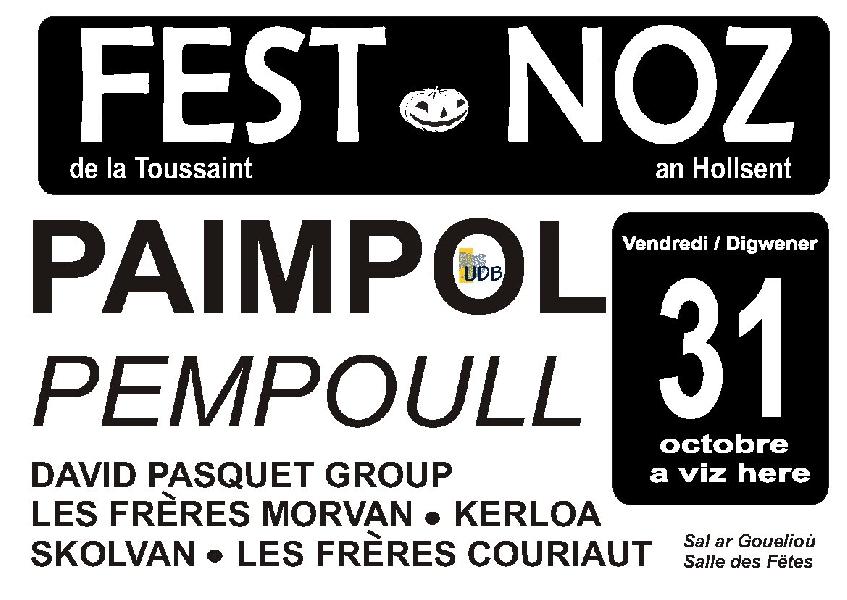 La fédération du Trégor-Goëllo de l'UDB organise comme tous les ans un fest noz à la Toussaint, à Paimpol. Au programme : David Pasquet Group, Les Frères Morvan, Skolvan, les Frères Couriaut, Kerloa