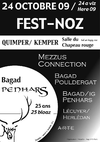L'association du Bagad PENHARS organise un grand FEST-NOZ SAMEDI 24 OCTOBRE 2009 Salle du Chapeau Rouge à Quimper Avec : Mezzus Connection, le bagad de Pouldergat, le bagad Penhars, le bagadig Penhars, les sonneurs