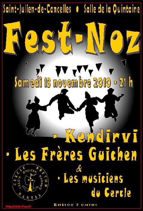 Le Cercle Breton de Nantes organise son fest noz annuel le samedi 13 novembre 2010 à partir de 21 heures. Animé par Kendirvi, les Frères Guichen et les musiciens du Cercle