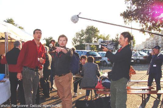 - Des <i>Loeroù Ruz</i> au salon. Au fond Michel Sourget de Radio AlterNantes ; Ronan Dantec des Verts et Claudie Poirier directrice de la Saint Yves / Gouel Erwan.