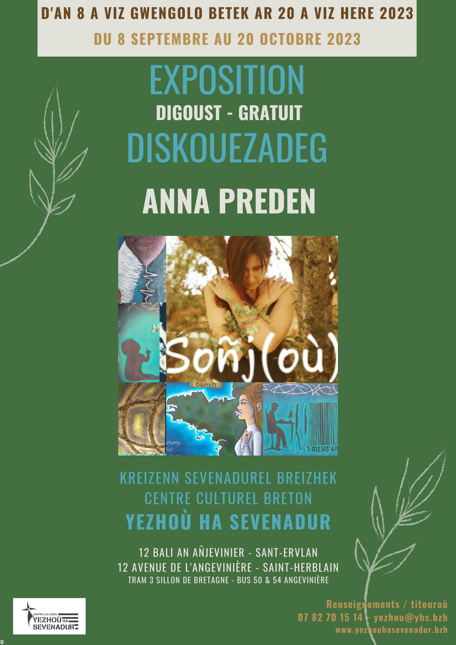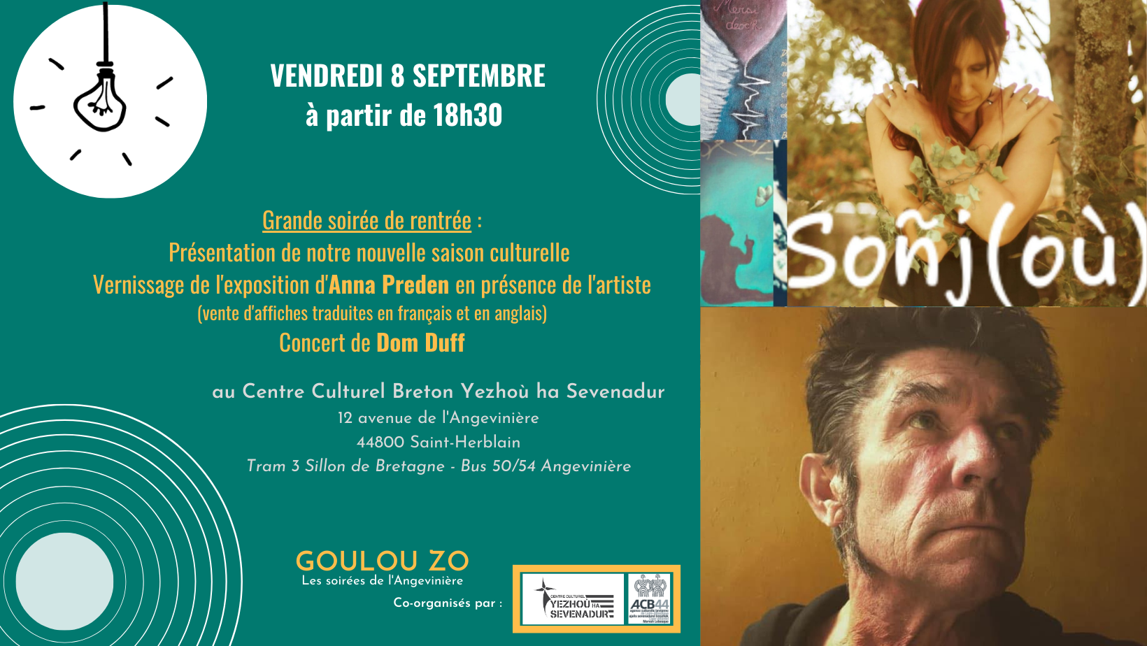 18h30 : Soirée d’inauguration de l’exposition « soñj(où) » avec Anna Preden + Présentation de la saison culturelle du Centre « Yezhoù ha sevenadur » 20h00 : Concert de Dom’ Duff