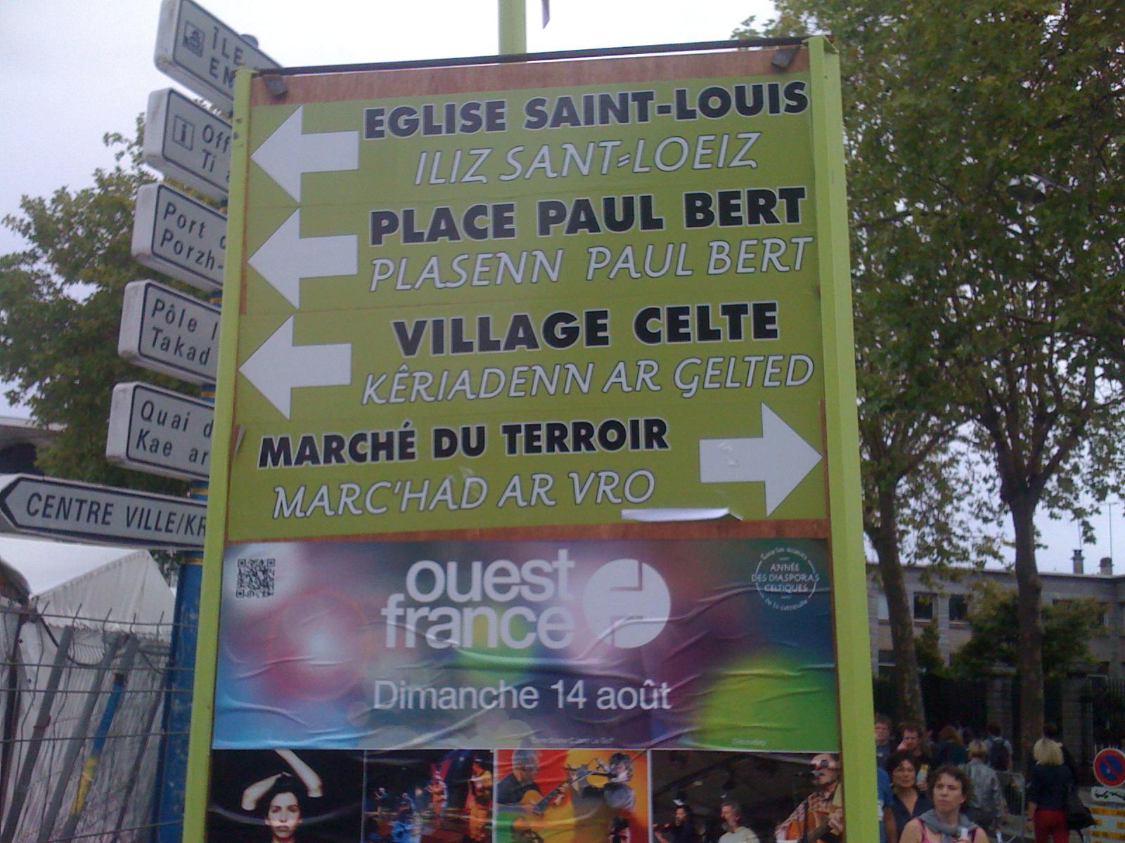 Question récurrente depuis des années, sinon des dizaines d'années, que la présence de la langue bretonne au Festival Interceltique de Lorient. Tous ceux qui ont eu à s'occuper de cette question, de près ou de loin, les années passées, ont connu des situations très diverses, relevant plus du bricolage que d'une politique claire en la matière de la part de la direction du FIL. Bien qu'ayant signé la charte "Ya d'ar Brezhoneg" il y a plusieurs années, les avancées furent minimes et ce n'est que depuis 3 ans que l'on voit les choses s'améliorer petit à petit. Cette année 2011 a vu plusieurs initiatives qui ont renforcé la présence de la langue bretonne ; de plus, le directeur du festival, Lisardo Lombardía, est très clairement en faveur de ce renforcement.Pour cette année, on peut tenter de faire une petite liste de réalisations : – la nouvelle signalétique entièrement bilingue bien qu'imparfaite ; – la présentation en breton sur plusieurs sites du festival ; – une programmation largement ouverte à la langue bretonne au nouveau Dôme du FIL (artistes, cinéma, documentaires) ; – une initiation à la langue bretonne dans les jardins de l'Hôtel Gabriel ; – une journée consacrée à la langue bretonne et aux langues celtiques à l'Espace Paroles ; – sans compter des spectacles bilingues comme "Glenmor, an disuj" – ou "Chansons d'orgueil" ; – ou encore les animations de l'école Diwan de Lorient ; – ou encore la messe du FIL en langue bretonne ; – le bilinguisme de la radio du FIL, etc.