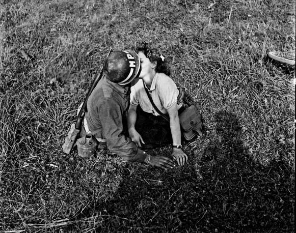 - Une Bretonne embrasse chaudement un GI sur la route de Dole-de-Bretagne (collection John G Moriss)