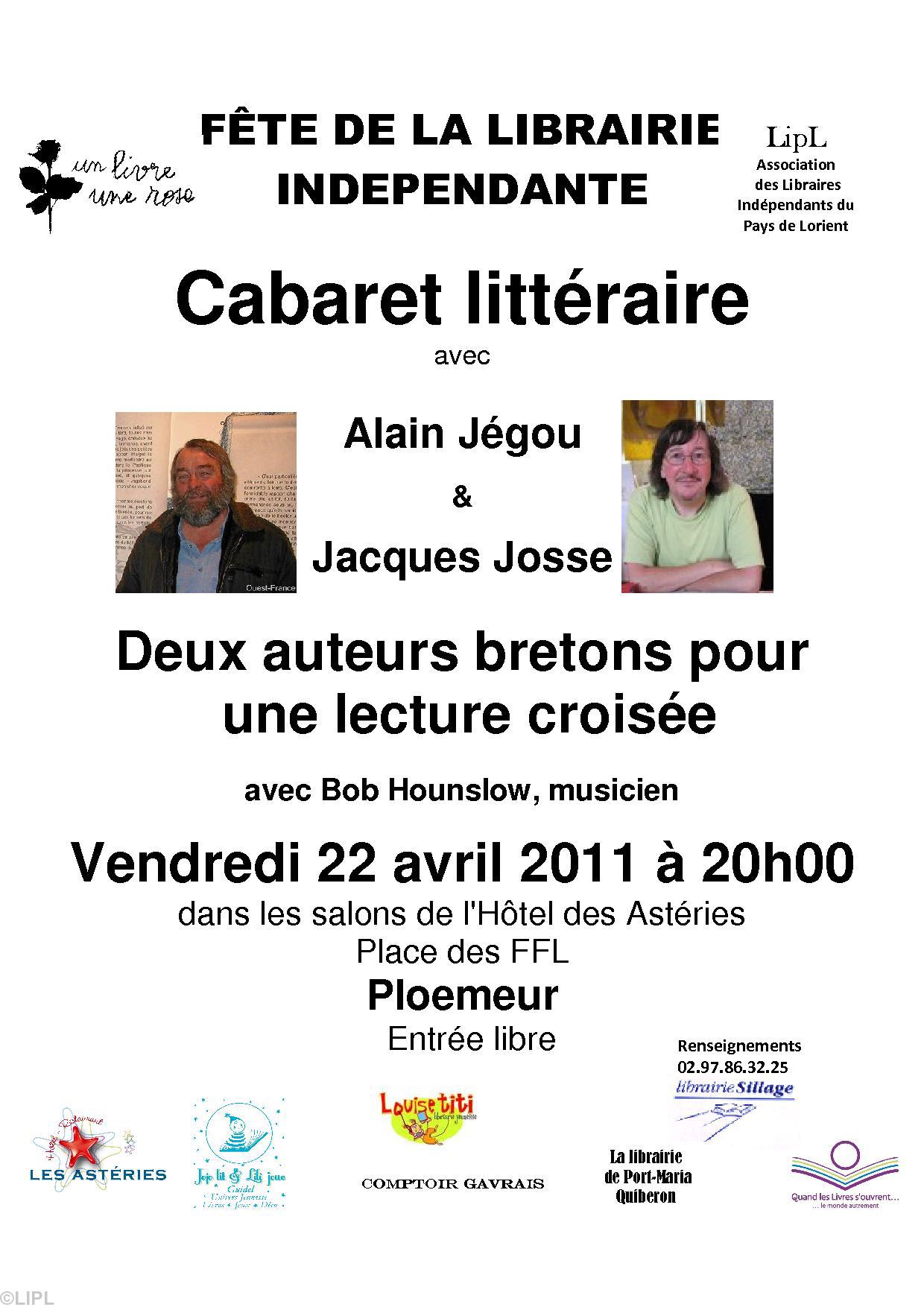 A l'occasion de la fête "un livre , une rose", l'association des libraires indépendants du pays de Lorient organise un cabaret littéraire avec Alain Jégou & Jacques Josse, deux auteurs bretons pour une lecture croisée.