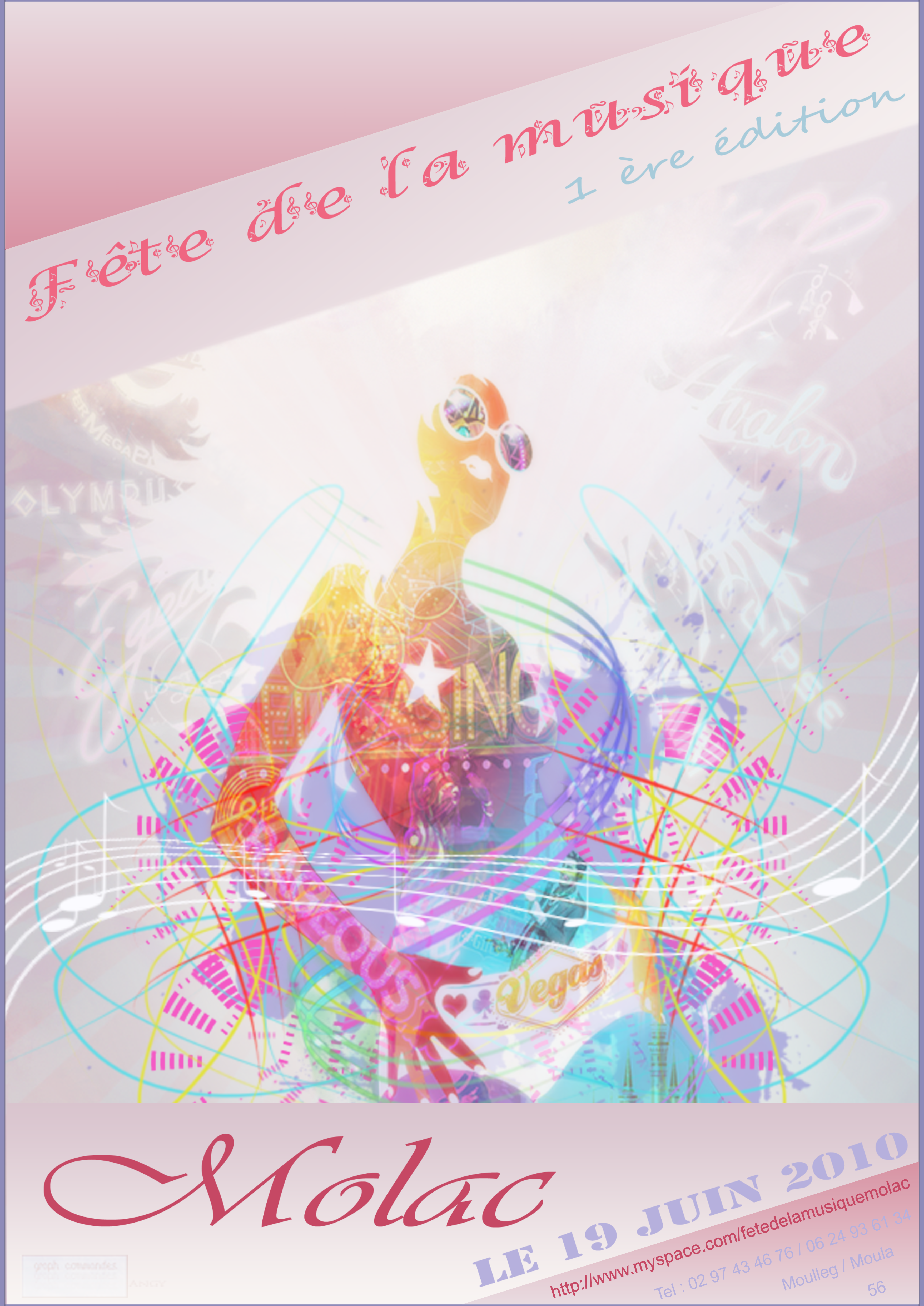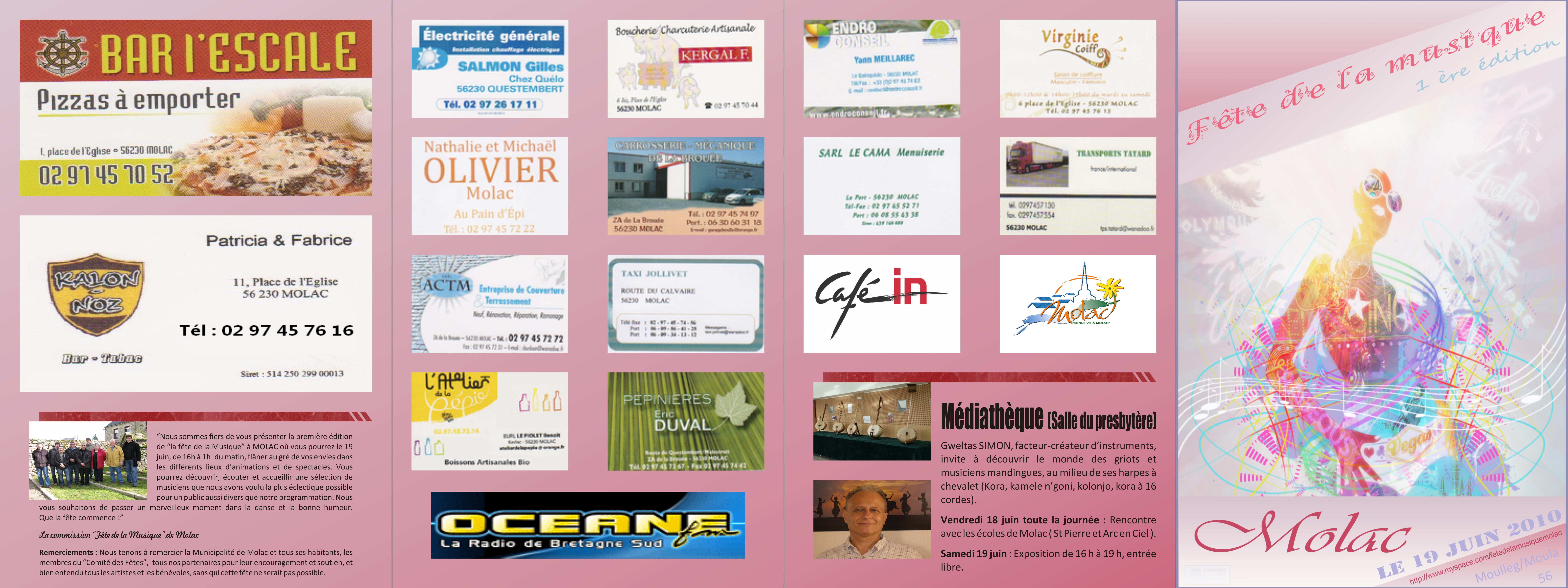 Après plusieurs mois de préparation, notre commission d'organisation, composée de bénévoles, est heureuse de vous présenter le programme de la fête de la musique qui aura lieu à Molac (56-Moulleg-Moula) le samedi 19 juin 2010, de 16 heures à 1 heure environ. Elle se déroulera dans 6 lieux : les 2 bars du bourg, sur deux scènes extérieures (rock reggae world et fest-noz), sur la place du bourg et à l'église. Près de 24 groupes musicaux différents participeront pour vous offrir une programmation culturelle la plus éclectique possible. Une restauration rapide avec tables et chaises sera ouverte dès 18h30, les 2 Bars, buvettes (avec gamme classique, bière bretonne, vins, boissons locales bio,...).