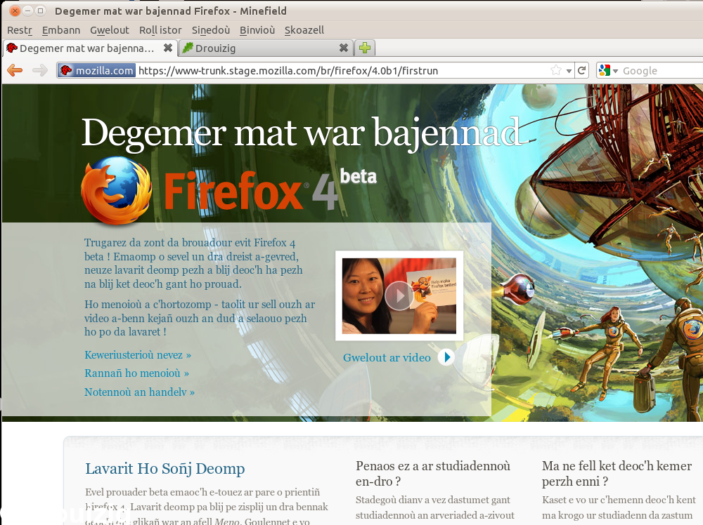 Le mois dernier est sortie une nouvelle pré-version du logiciel Firefox, le navigateur web de la fondation Mozilla. Cette version, le Firefox 4 beta 7, permet d'avoir un aperçu de ce que sera la version finale du logiciel. Vous pouvez aider à en préparer la version finale en breton