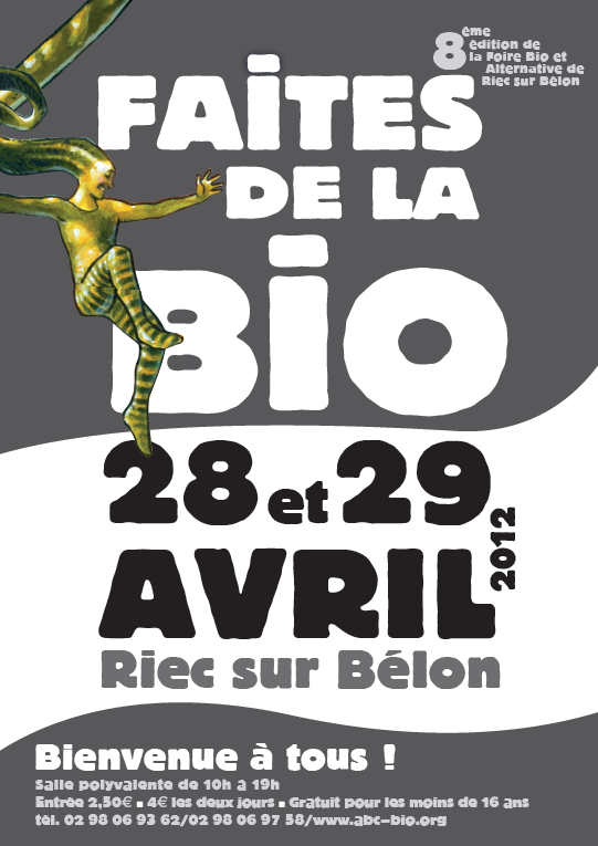 La plus grande, avec celle de Mur-de-Bretagne.Organisée par ABC (Agriculteurs Bio de Cornouaille), la Foire bio et Alternative de Riec-sur-Belon aura lieu les 28 et 29 avril. Cette année le thème principal pour les Conférences est " Le Jardin ". Environ 120 exposants seront présents, en particulier " l'éco-habitat ", avec les nouvelles énergies : éoliennes, axe vertical et horizontal, solaire etc. Et bien sûr l'alimentation, vins, produits d'entretien, artistiques, de nombreuses associations. Beaucoup d'ateliers pour apprendre ou vous perfectionner pour grands et petits. site : www:abc-bio.org courriel : abcfoirebio@gmail.com
