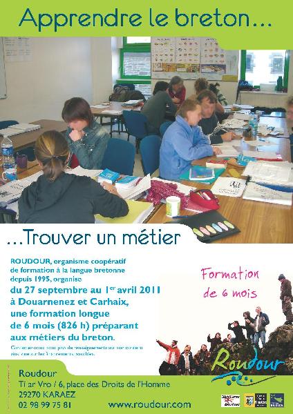 Roudour, organisme de formation en langue bretonne basé à Carhaix, proposera une formation de six mois à partir de la rentrée à Douarnenez et à Carhaix. Les deux sessions se dérouleront du 27 septembre au 1er avril 2011 et compteront 826 heures de formation