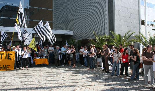 Lundi 30 juin entre 17 h 30 et 19 h30, près de 200 personnes se sont rassemblées devant le palais des Congrès à Nantes pour protester contre la participation de Jacques Auxiette et de la région Pays de la Loire au forum mondial des Droits de l\'Homme.