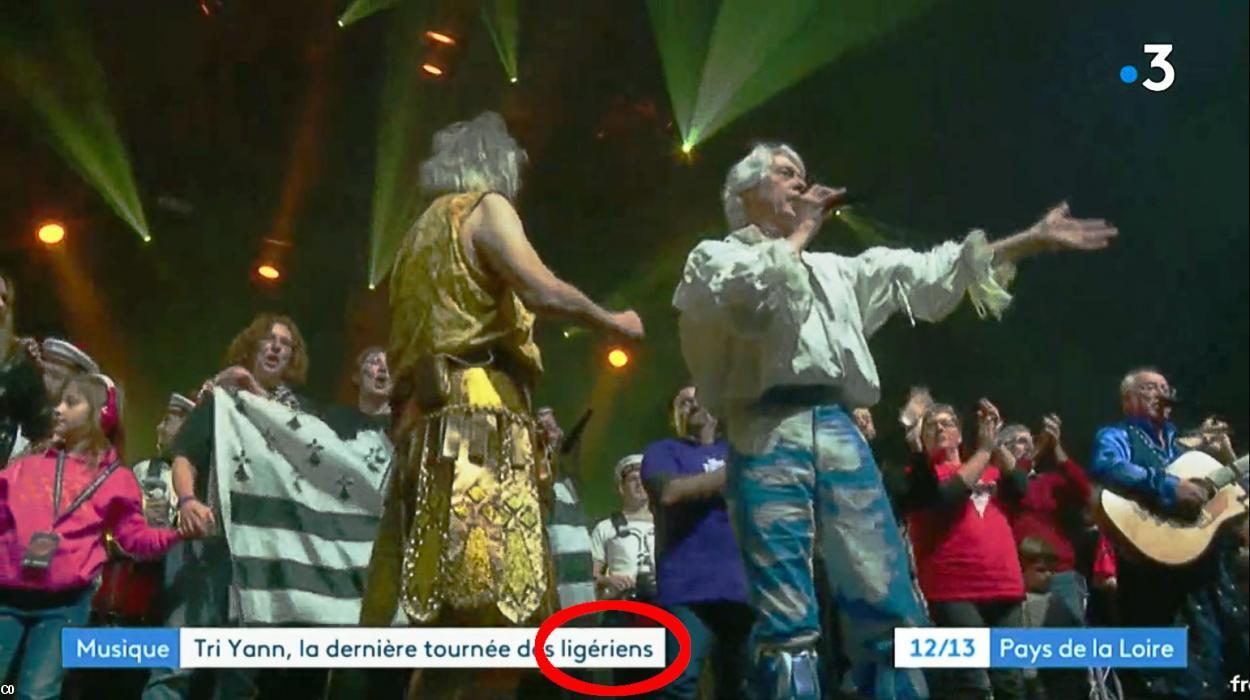 Dans une émission consacrée aux adieux d'un des fleurons de la musique bretonne TRI YANN AN NAONED, un groupe au nom pourtant carrément breton, et dont l'ambition a été dès le début de faire revivre la si riche tradition musicale bretonne, France 3 Pays de la Loire les a labellisés "Le groupe ligérien".