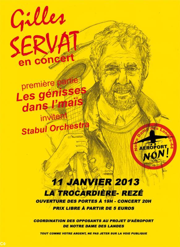 Gilles Servat en concert, avec en première partie : Les génisses dans l'maïs invitent Stabul Orchestra. Concert de soutien organisé par la coordination des opposants au projet de Notre Dame des