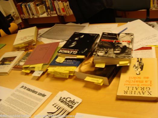Ce n'était pas une conférence dans les règles : titre, chapitre I, chapitre II etc. et conclusion. C'était comme si le conférencier recevait les 50 auditeurs dans son salon pour leur parler de Glenmor, mais aussi de Grall, Xavier - indissociables selon Michel Chauvin, nous lisant des passages de l'un, de l'autre, ou encore de l'un à propos de l'autre, de l'autre à propos de l'un, si bien qu'on ne savait plus trop parfois qui avait écrit sur qui. Mais peu importait. La Fête de nuit de Xavier Grall, où Glen est Glenmor et Arzel l'auteur, Les Emblaves et la moisson de Glenmor ou encore la biographie de Xavier Grall par Mikaela Kerdraon (1), tous ces livres et d'autres étaient devant lui avec le Kan ha diskan, correspondances Grall-Glenmor de cette dernière (2), tous hyper frangés de jaune comme s'il y avait des post-it à chaque page ! Il avait tant à nous dire que deux heures ne suffirent pas...