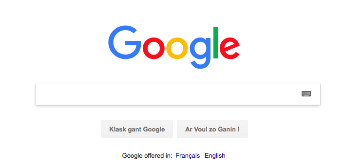 On peut toutefois avoir une interface en breton, une des 150 langues proposées en option pour l'interface. Pour le breton on ajoute à l'URL l'option de la langue d'interface : google.com/?hl=br https://www.google.com/?hl=br