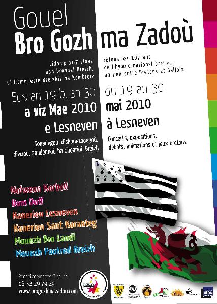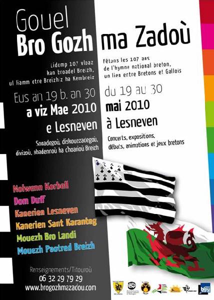Le Bro gozh ma zadoù (Vieux pays de mes pères) est l'hymne national de la Bretagne. Il est inspiré de l'hymne national du Pays de Galles, Hen Wlad Fy Nhadau (Vieille terre de mes pères). L'hymne de Cornouailles, Bro Goth Agan Tasow l'équivalent en cornique, reprend lui aussi l'air de l'hymne gallois. Enfin, on le retrouve aussi chez le peuple khasi dans le nord-est de l'Inde. Les origines galloises Selon la légende, James James aurait imaginé l'air de la chanson tandis qu'il se promenait sur les rives du fleuve Rhondda. En le chantant à son père Evan James, un tisserand et poète de Pontypridd, ce dernier en écrivit les paroles. Initialement appelée Glan Rhondda (Les rives du fleuve Rhondda), elle fut jouée pour la première fois en janvier ou février 1856 à la chapelle de Capel Tabor par une chanteuse appelée Elizabeth John. L'importation en Bretagne En Bretagne, ce chant fut d'abord un cantique ; l'air est importé de Galles par W. Jenkyn Jones, Gallois protestant envoyé en mission à Quimper. Il crée des paroles en breton sur l'air de Hen Wlad Fy Nhadau, intitule sa composition Doue ha va Bro (Dieu et mon pays) et la publie dans un recueil de cantiques, Telen ar C'Hristen ("La harpe du chrétien"). François Jaffrennoù (Taldir Jaffrenoù) (1879-1956), alors lycéen et élève de François Vallée, s'inspire de ces paroles pour créer la version que l'on connaît aujourd'hui. Le texte sort en 1898 dans La Résistance de Morlaix et fut imprimé sur feuilles volantes avec sous-titre Henvelidigez (Adaptation). Il parait dans le livre An Delen Dir (La harpe d'acier) en 1900, et commence sa vogue dans les réunions des étudiants bretons de Rennes, qui en firent leur chant de ralliement. Le Bro Gozh fut choisi par le jury de l'Union régionaliste bretonne et proclamé « Chant national », en raison de la fraternité qui rapprochait Bretons et Gallois, au Congrès de Lesneven en 1903. Maurice Duhamel écrivit pour cet hymne une nouvelle harmonisation pour piano, et il fut enregistré par Pathé frères, de Paris, sur disques phonographiques en 1910. Depuis, le Bro Gozh est joué régulièrement dans des cérémonies officielles, dans des stades, dans des concerts, etc…. Du centenaire vers une fête annuelle En 2004, à l'initiative du Comité Bro Gozh, le centenaire du Bro Gozh est fêté à Lesneven en présence d'une délégation galloise et près de 1.500 participants ; en 2006, c'est le 150e anniversaire de l'hymne gallois qui est fêté à Pontypridd (Pays de Galles) en présence de délégations bretonne et cornouaillaise. En 2009, il est décidé de continuer sur cette voie et de développer les actions pour la promotion du Bro Gozh en tant qu'hymne national de la Bretagne, notamment par la création d'une fête annuelle, Gouel Bro Gozh ma Zadoù.Le programme — Expositions du 19 au 30 mai : – Le Cabotage entre Bretagne et Pays de Galles (CREDIB) (1), Chapelle Saint François, Lesneven ; – Création celtique contemporaine (Spered Kelt) (2), Chapelle Saint Joseph, Lesneven ;