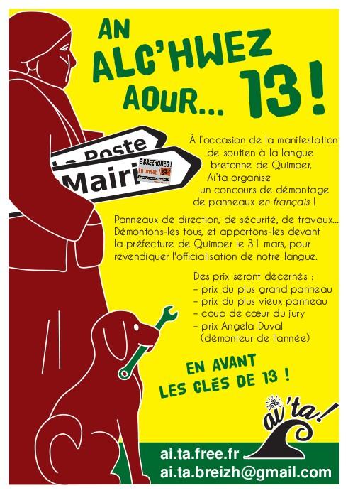 Le jury d'Ai'ta ! se réunira samedi prochain à Kemper afin de juger le travail de démontage des panneaux où la langue bretonne est exclue… Lequel emportera le grand prix Anjela Duval, « An Alc'hwez Aour 13 » ?