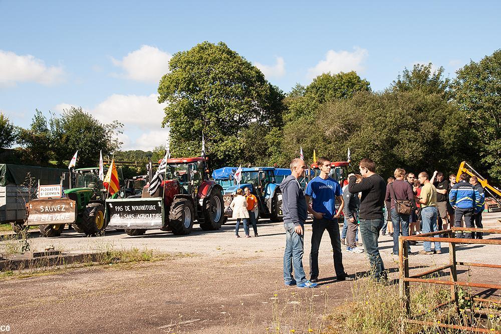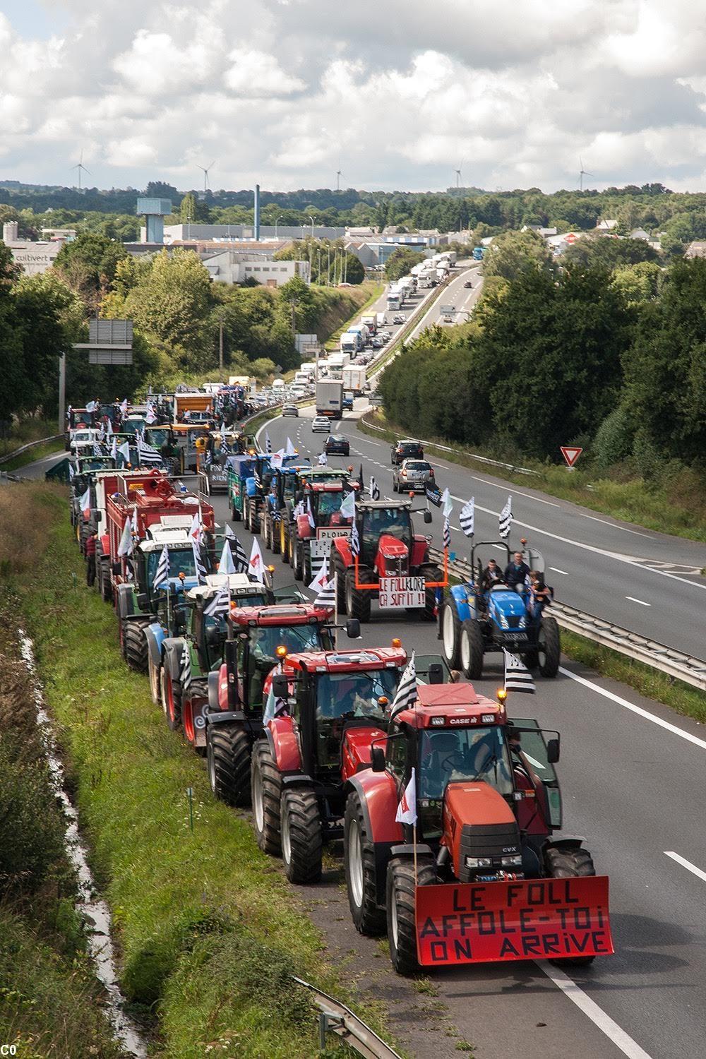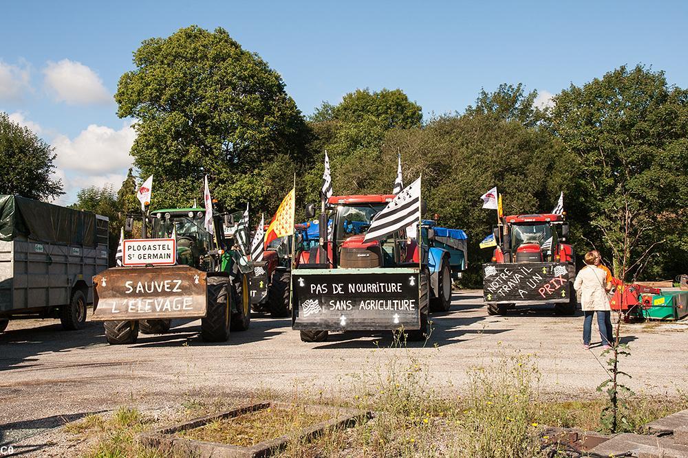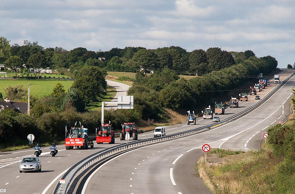 La grande manifestation des agriculteurs, à l'échelon national pour la première fois depuis le début de la crise du porc, a débuté ce matin à 8 heures à la pointe Saint-Mathieu. Les agriculteurs du centre Bretagne rejoignent en ce moment à Guingamp le convoi du Finistère dont les 60 tracteurs partis ce matin de la pointe Saint-Mathieu. La direction du cortège est vers la ville de Caen en Normandie, puis Paris. Les départements du sud de la Bretagne et les Vendéens passeraient, eux, par Rennes selon les sources d'ABP. Environ 1 000 engins agricoles ou plus devraient arriver sur les périphériques de Paris en fin de journée le 3 septembre.
