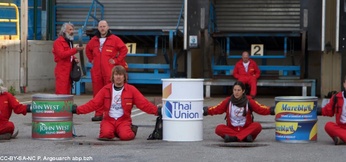 Les militants, une équipe internationale dont certains sont venus de Grande-Bretagne ou d'Italie, juchés à une dizaine de mètres de hauteur ont entrepris de repeindre la façade de l’usine tandis qu’une dizaine de personnes, enchaînées à des boîtes de thon géantes bloquent l’accès aux camions de livraison.