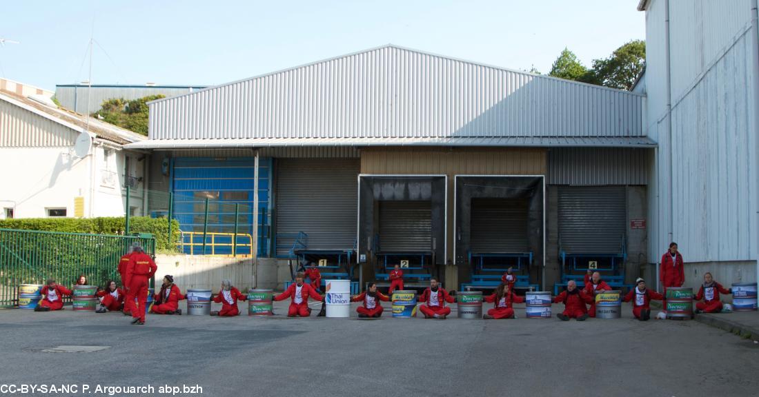 Depuis 6 h 50 ce matin, 25 activistes de Greenpeace bloquent l’usine Petit Navire pour dénoncer les méthodes de pêche du numéro un français du thon en boîte.