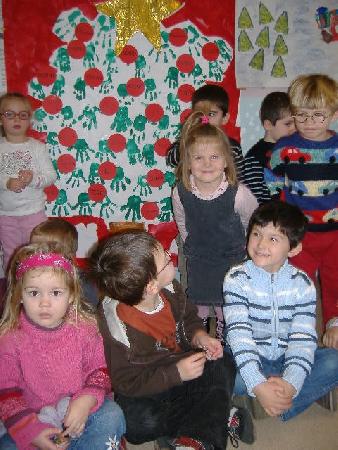 L'institutrice, Laurence Pennamen, a répondu à cette initiative, pour la seconde année. Elle a réalisé avec ses élèves, de la toute petite section à la grande section de maternelle, un sapin formé des mains de chaque enfant. Ce sapin est décoré par des boules au nom de chaque élèves. Chacun a ainsi pu participer à la réalisation de cette fresque.