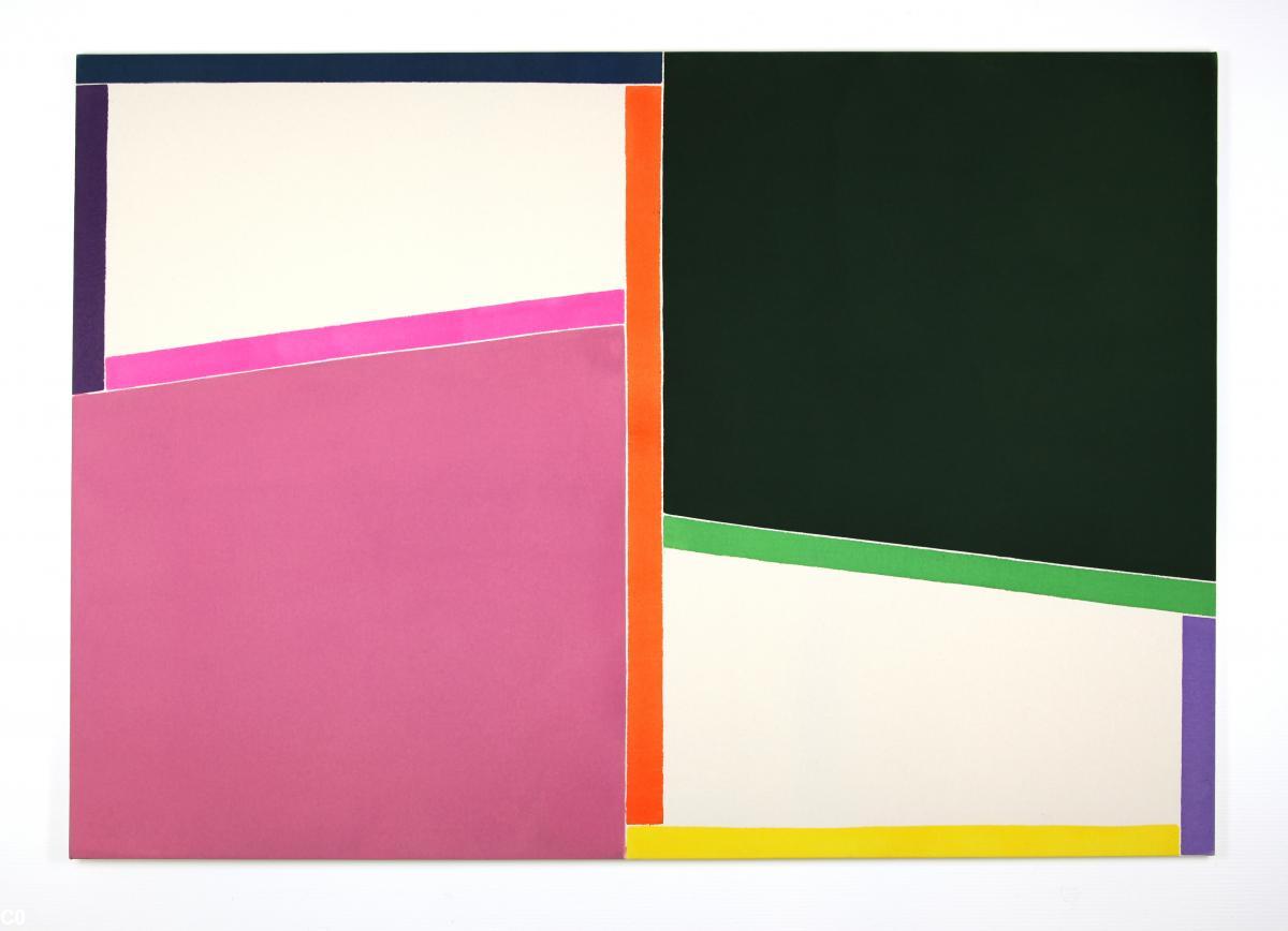 La palette est vive et contrastée : harmonie de jaune et de vert, d’orangés et de bleu… mais aussi accords plus feutrés, du beige au gris. Les formes sont des plus simples : deux rectangles en déséquilibre avec de grandes respirations données par les blancs ou les tons écrus de la toile vierge.