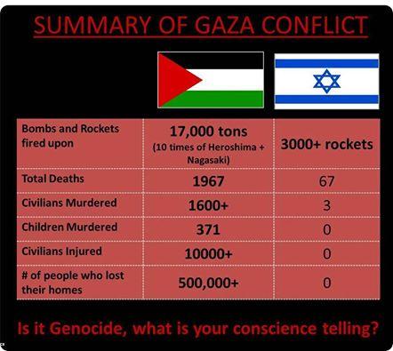 27 jours de bombardements, plus de 1800 palestiniens tués, plus de 9000 blessés, des centaines d'habitations détruites ou endommagées, des écoles (y compris de l'UNRWA), des hôpitaux, des mosquées et des ambulances bombardées.