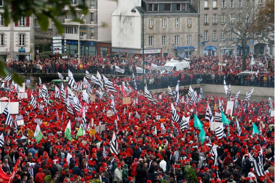 Les sonneurs étaient là et on aurait pu se croire au festival de Cornouaille (1), mais le ton n'était pas du tout à la fête. Tout le monde a été surpris par le niveau de mobilisation tant du côté des organisateurs que du côté des pouvoirs publics. Il y avait bien entendu les figures emblématiques de la pêche, du monde agricole ou du monde ouvrier local. Mais il y avait surtout des petits patrons, des professions indépendantes, des artisans, des familles entières avec leurs enfants, des salariés, des retraités, et surtout beaucoup de jeunes...