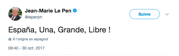 C'était juste il y a une semaine, JMLP le fondateur du Front National et son président d'honneur, citait un de ses leaders préférés le "généralissime" Francisco Franco, dictateur et grand liquidateur des Catalans communistes, anarchistes ou simples indépendantistes. Le président d'honneur du Front national a twitté "España, Una, Grande, Libre!" (Espagne, Une, Grande, Libre), qui n'est autre qu'une des devises utilisées par le régime de Franco, mais toujours utilisée aujourd'hui quand les franquistes descendent dans la rue